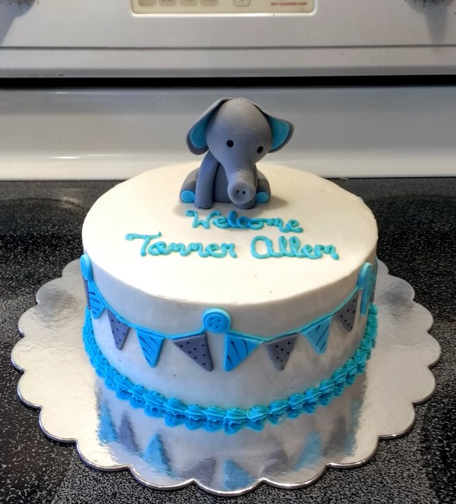 An 8″ vanilla cake iced with vanilla buttercream. The elephant and bunting banner are hand made from fondant.