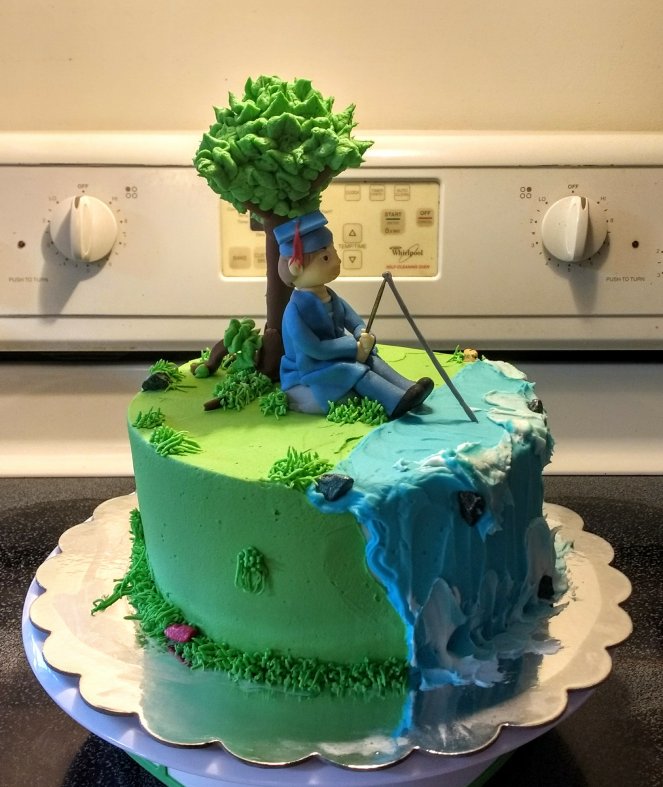An 8″ vanilla cake iced with vanilla buttercream. The tree and boy are hand made from fondant and modeling chocolate.