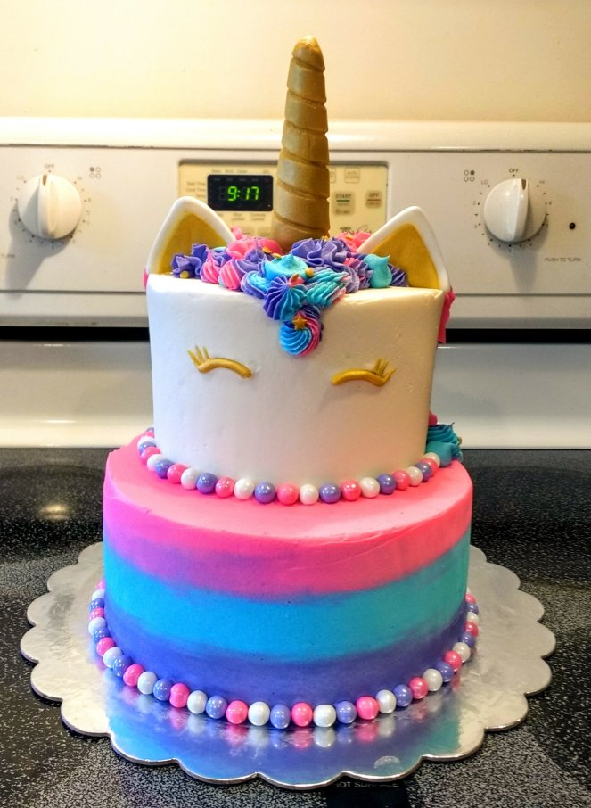 An 8″ chocolate cake and a 6″ vanilla cake. Both are iced in vanilla buttercream. The horn, eyes and ears are hand made from fondant.