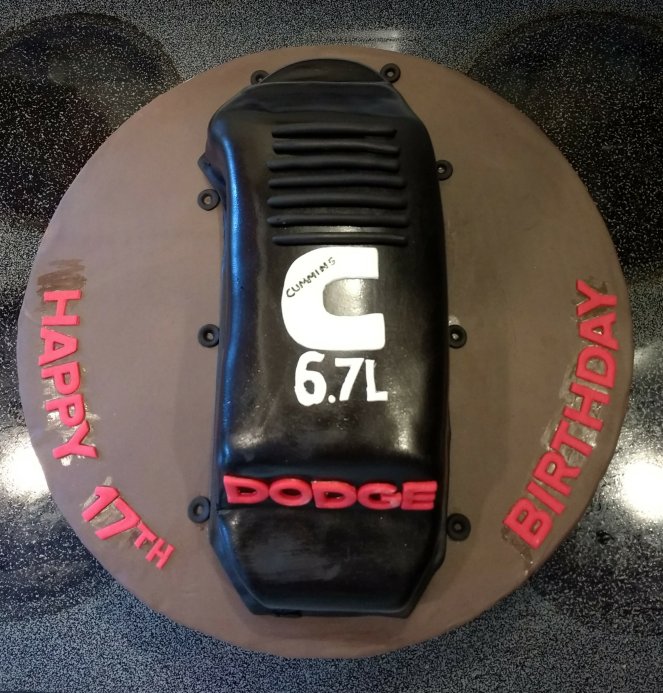 A vanilla cake carved and decorated to look like a valve cover. All decorations are hand made from fondant.