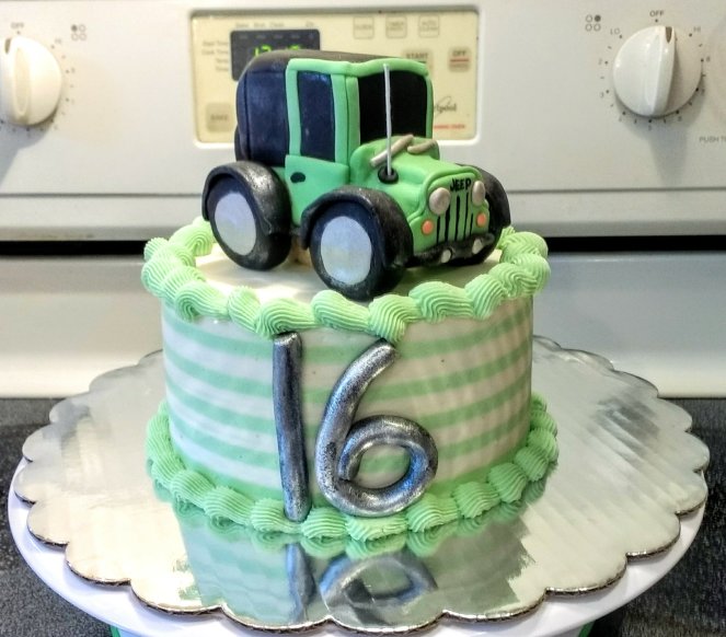 A 6″ vanilla cake iced with vanilla buttercream. The Jeep is hand made out of rice krispie treats and fondant! The “16” is also fondant.