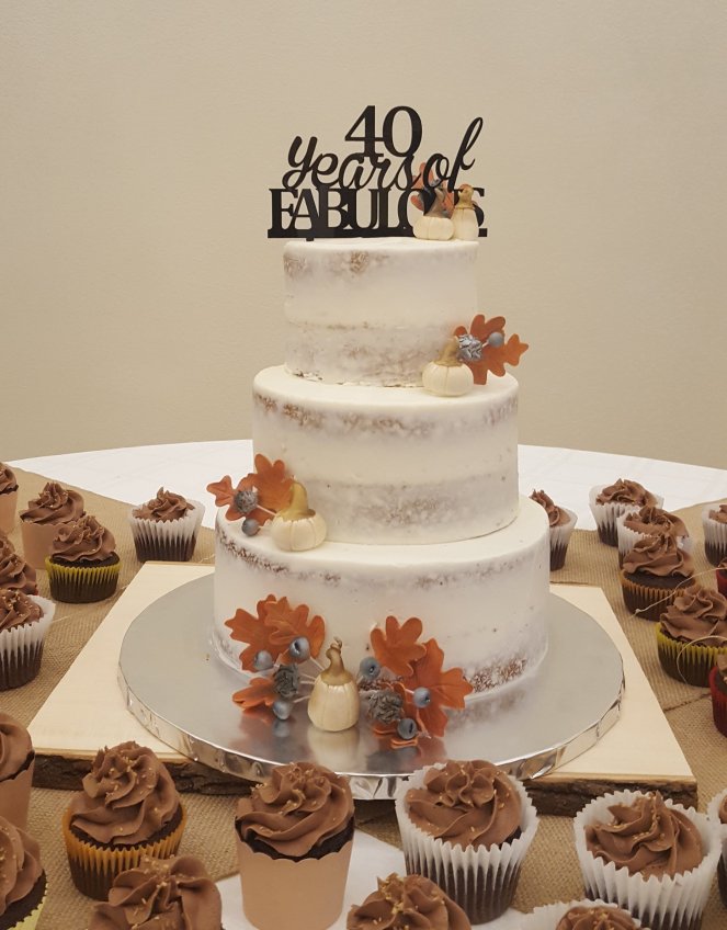 A 10″ vanilla cake iced with vanilla buttercream. An 8″ and a 6″ raspberry cake iced with white chocolate buttercream. They are all iced in the “naked” cake style. The leaves and pumpkins are hand made from fondant. Also made were 48 chocolate cupcakes iced with chocolate buttercream.