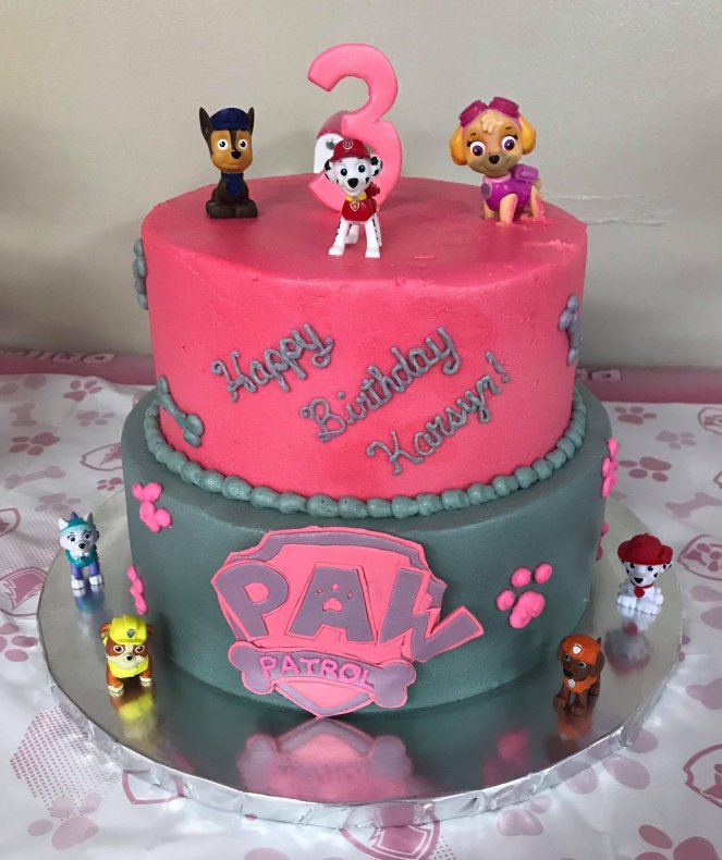A 10″ chocolate cake and an 8″ vanilla cake iced with vanilla buttercream icing. The symbol is hand made from fondant. The puppies are toys provided by the customer.