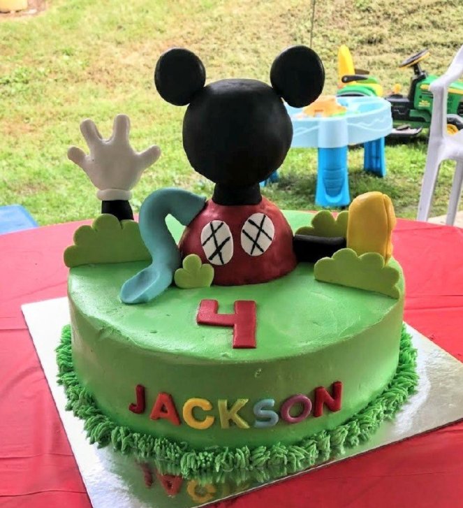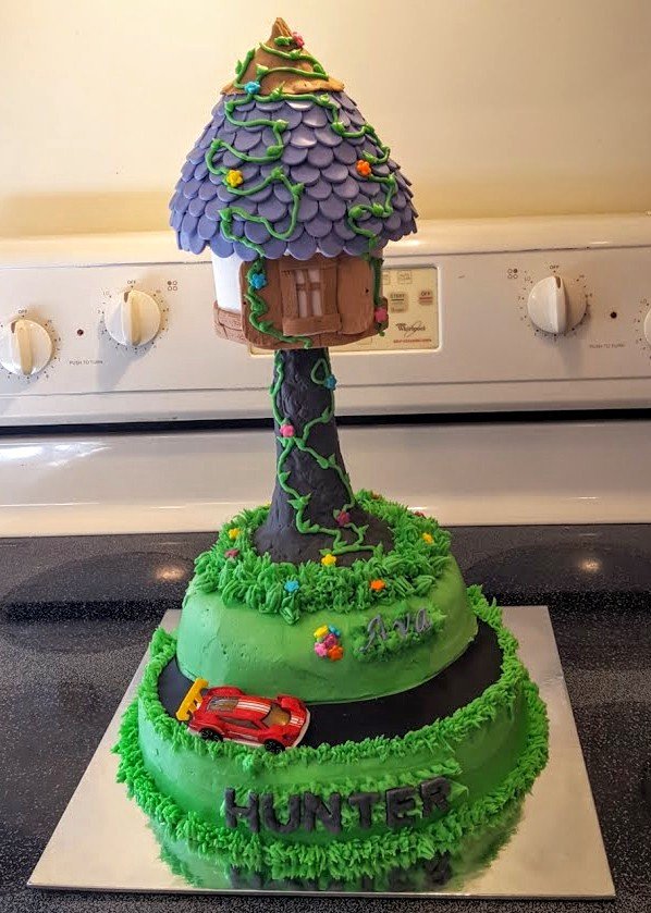 A combination birthday cake of hot wheels and Rapunzel’s tower. The “hill” is pink almond cake iced with vanilla buttercream. The tower is rice krispie and strawberry cake iced with vanilla buttercream and covered with fondant. All the decorations are hand made from fondant, except the car!