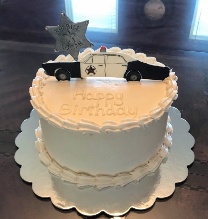 An 8″ vanilla cake iced with vanilla buttercream. The car and badge are hand made from fondant.