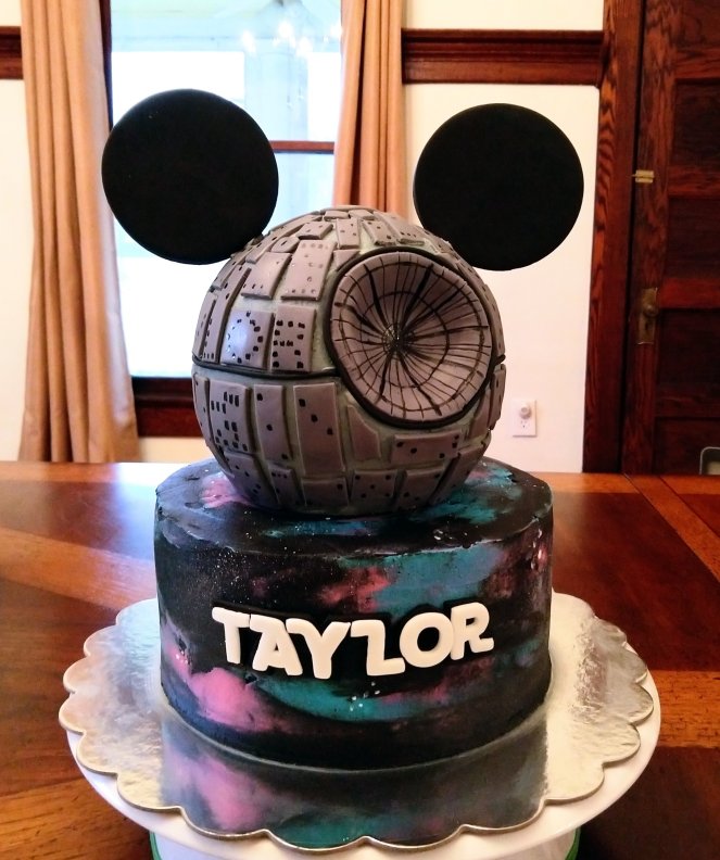 This cake was made in collaboration with Icing Smiles. The bottom is an 8″ chocolate cake iced with black, pink, purple and blue buttercream icing. The “death star” is a 6″ sphere vanilla cake iced with vanilla buttercream. The ears, name and death star details are hand made from fondant.