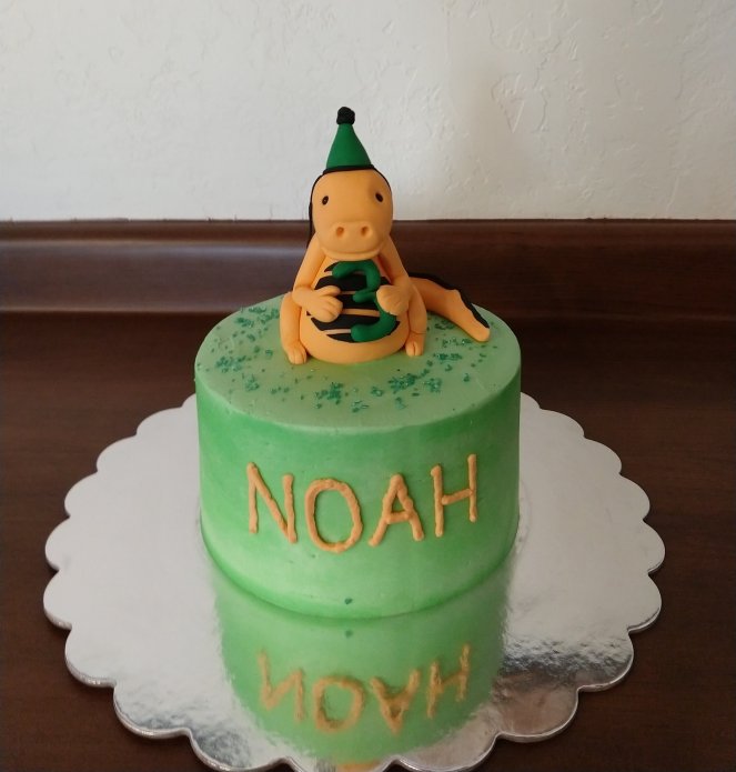 A 6″ vanilla cake iced with vanilla buttercream. The dinosaur is hand made from fondant.