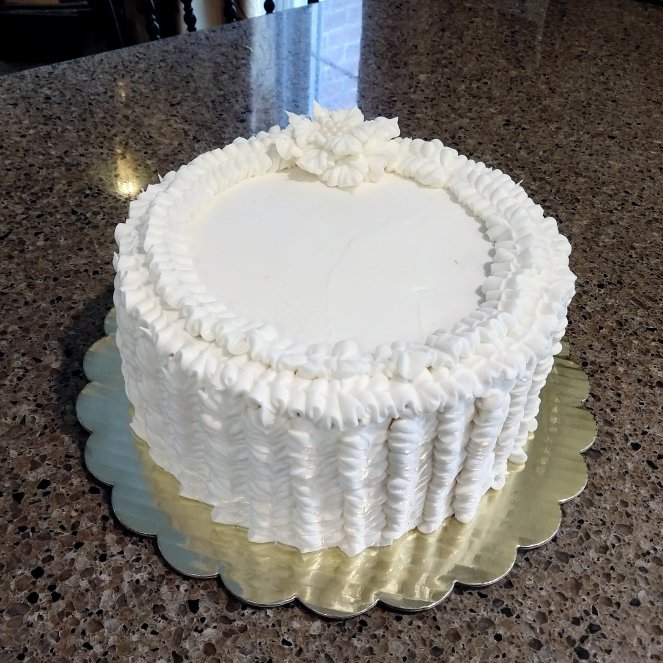 A simple, elegant white on white decorated cake. It’s an 8″ vanilla cake iced with vanilla buttercream.