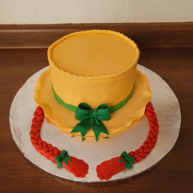 An 8″ raspberry cake with raspberry filling and iced with vanilla buttercream. The decorations are all handmade from fondant.