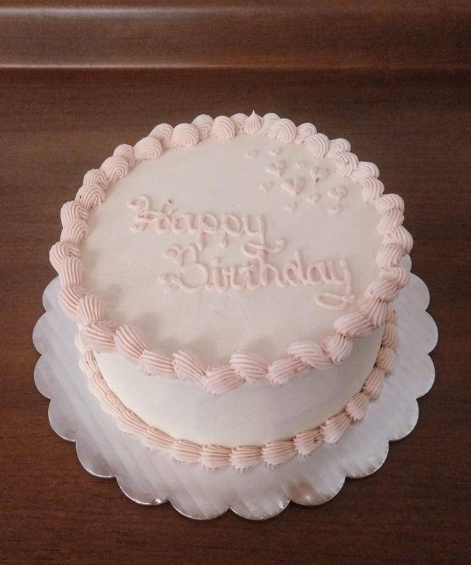 An 8″ raspberry cake with a raspberry filling iced with vanilla buttercream.