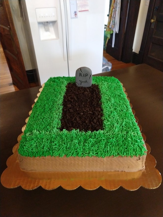 Birthdays · Other Occasions RIP December 7, 2019 cakeplaceLeave a comment A half sheet chocolate cake iced with chocolate buttercream. The tombstone is fondant and dirt is Oreos.