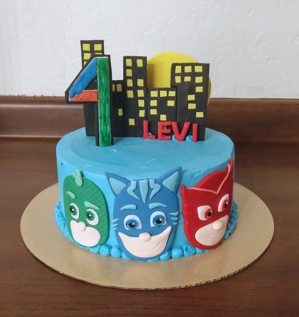 An 8″ vanilla cake iced with vanilla buttercream. All decorations are hand made from fondant.