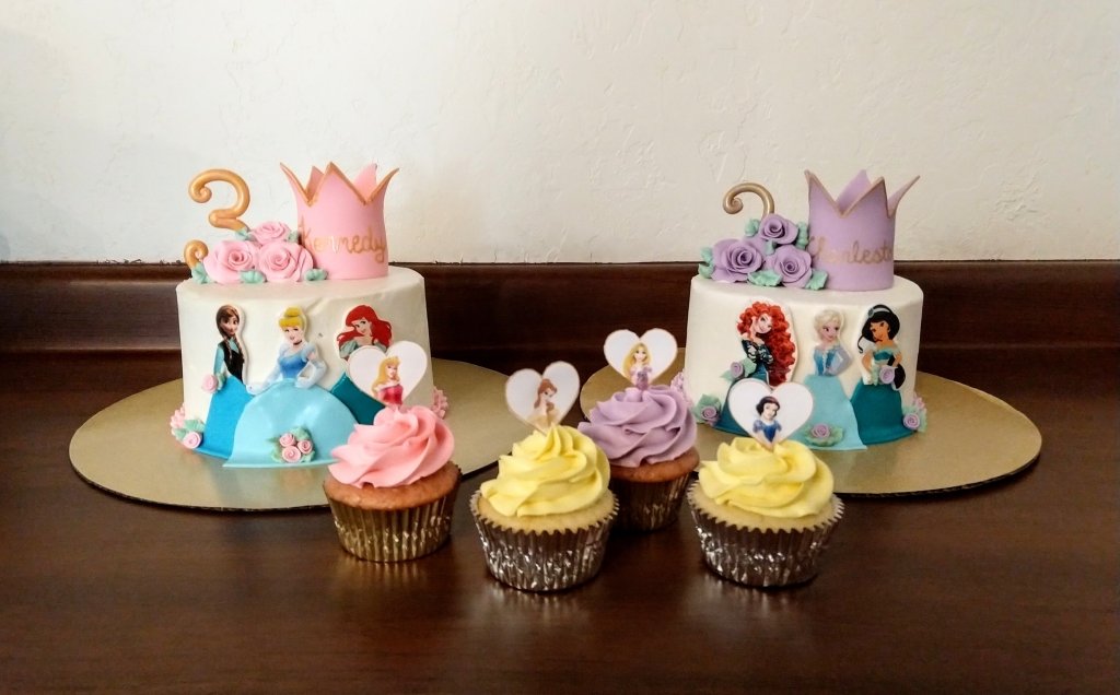 A 6″ vanilla cake, 6″ chocolate cake and strawberry cupcakes. All are iced with vanilla buttercream. All decorations on the cakes are hand made from fondant. The cupcake toppers were also made by me but from paper!