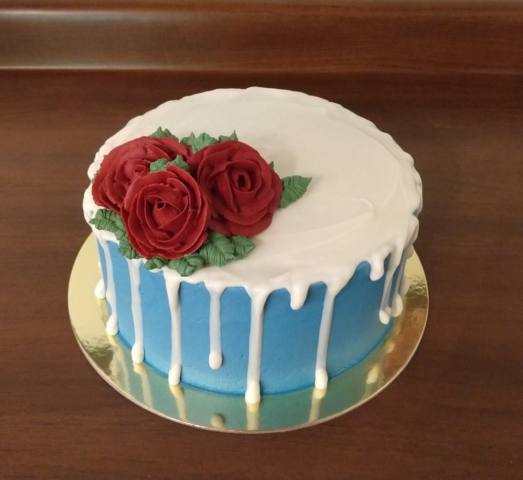 An 8″ chocolate cake, filled with whipped chocolate ganache and iced with vanilla (blue) buttercream. It has a white chocolate drip and buttercream red roses.