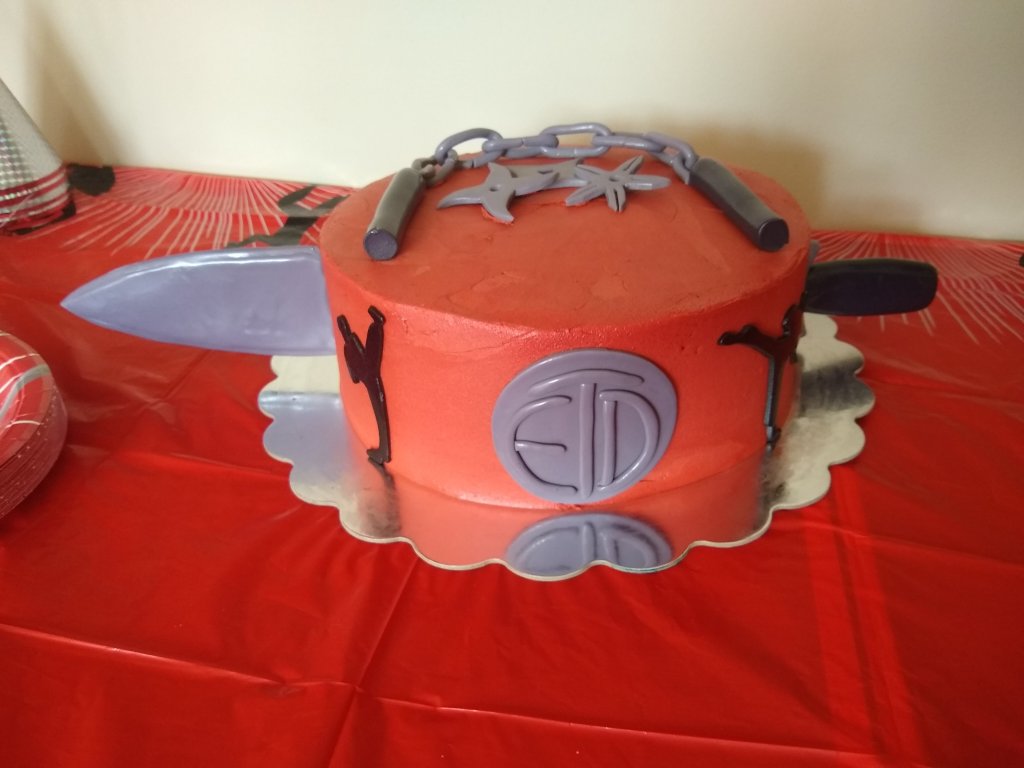 A 10″ half vanilla half chocolate cake iced with vanilla buttercream. All decorations are hand made from fondant.