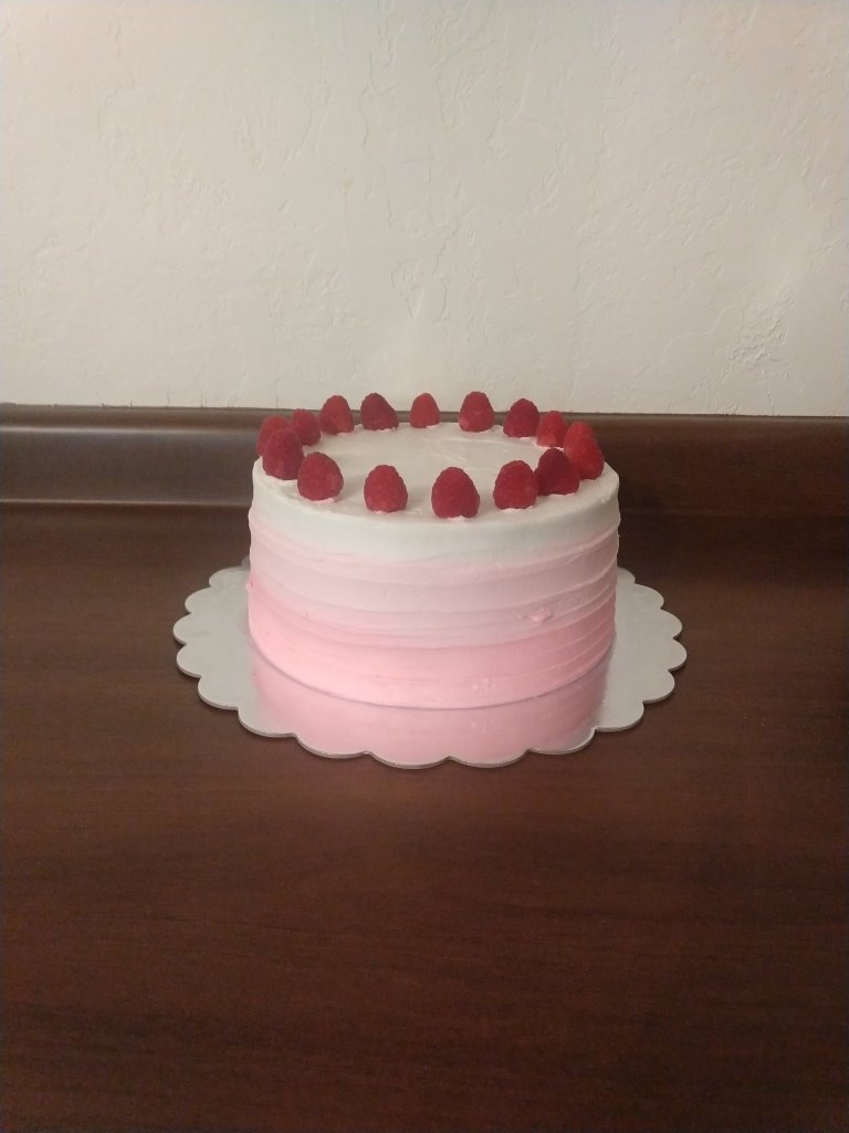 An 8″ raspberry cake with raspberry filling and iced with white chocolate buttercream. Fresh raspberries decorate the top.