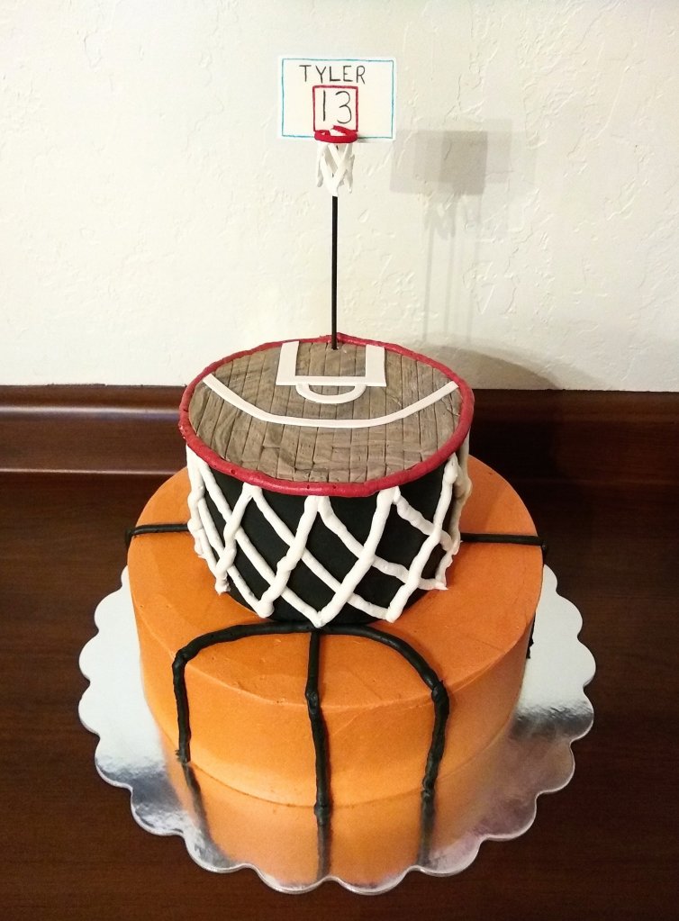 A 10″ vanilla cake iced with vanilla buttercream. A 6″ chocolate cake iced with chocolate buttercream. The “net” is buttercream and the “court” and “back board” are hand made from fondant.