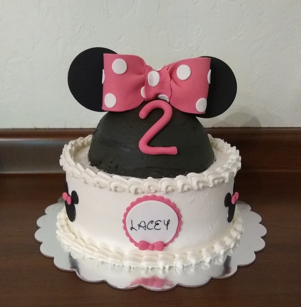 An 8″ vanilla cake iced with vanilla buttercream. A half round chocolate cake iced with chocolate buttercream. Decorated to look like a Minnie Mouse head.