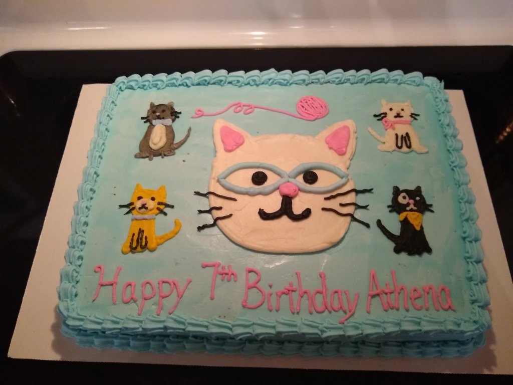 A vanilla half sheet cake iced with vanilla buttercream. Decorated with buttercream cats.