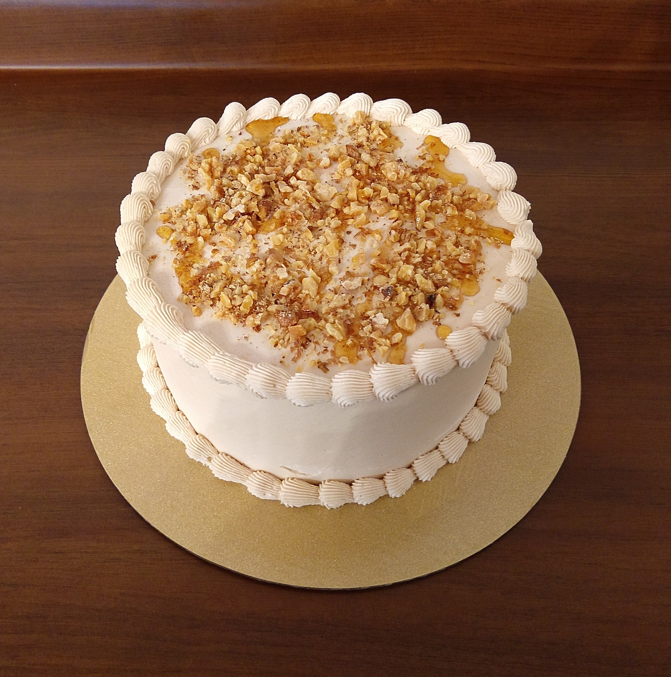 An 8″ maple flavored cake with toasted walnuts. It has a Walnut and maple syrup filling, iced with maple buttercream and topped with toasted walnuts and a maple drizzle.