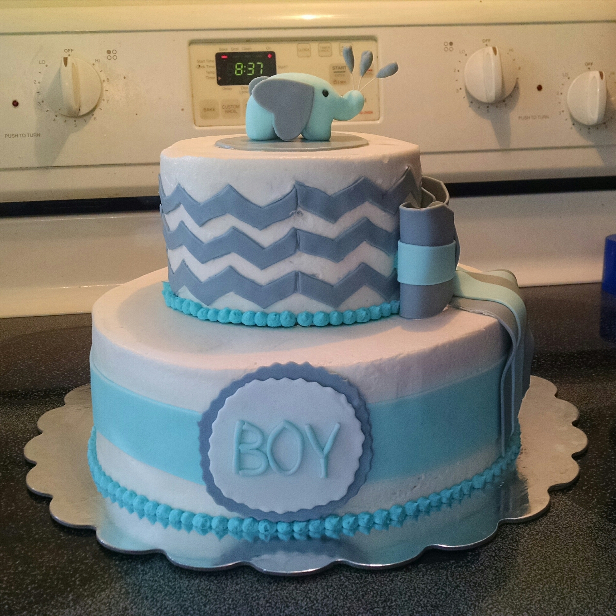 Baby elephant shower cake. 10″ white cake, 6″ chocolate cake all iced with vanilla buttercream. All decorations are hand made from fondant.