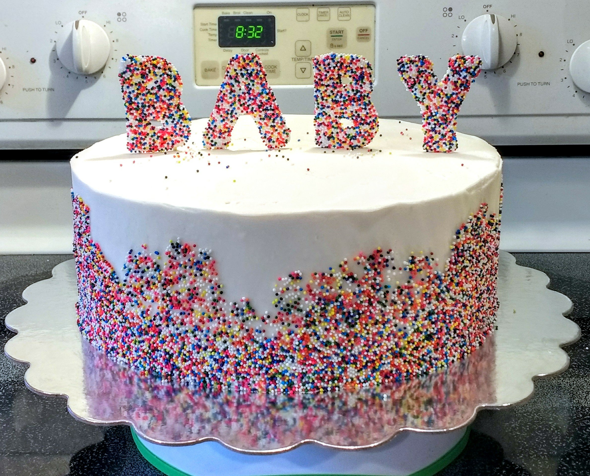 A 10″ vanilla cake iced with vanilla buttercream and covered in sprinkles. The letters are white chocolate covered with sprinkles and the cake was dyed blue to indicate “BOY”!!