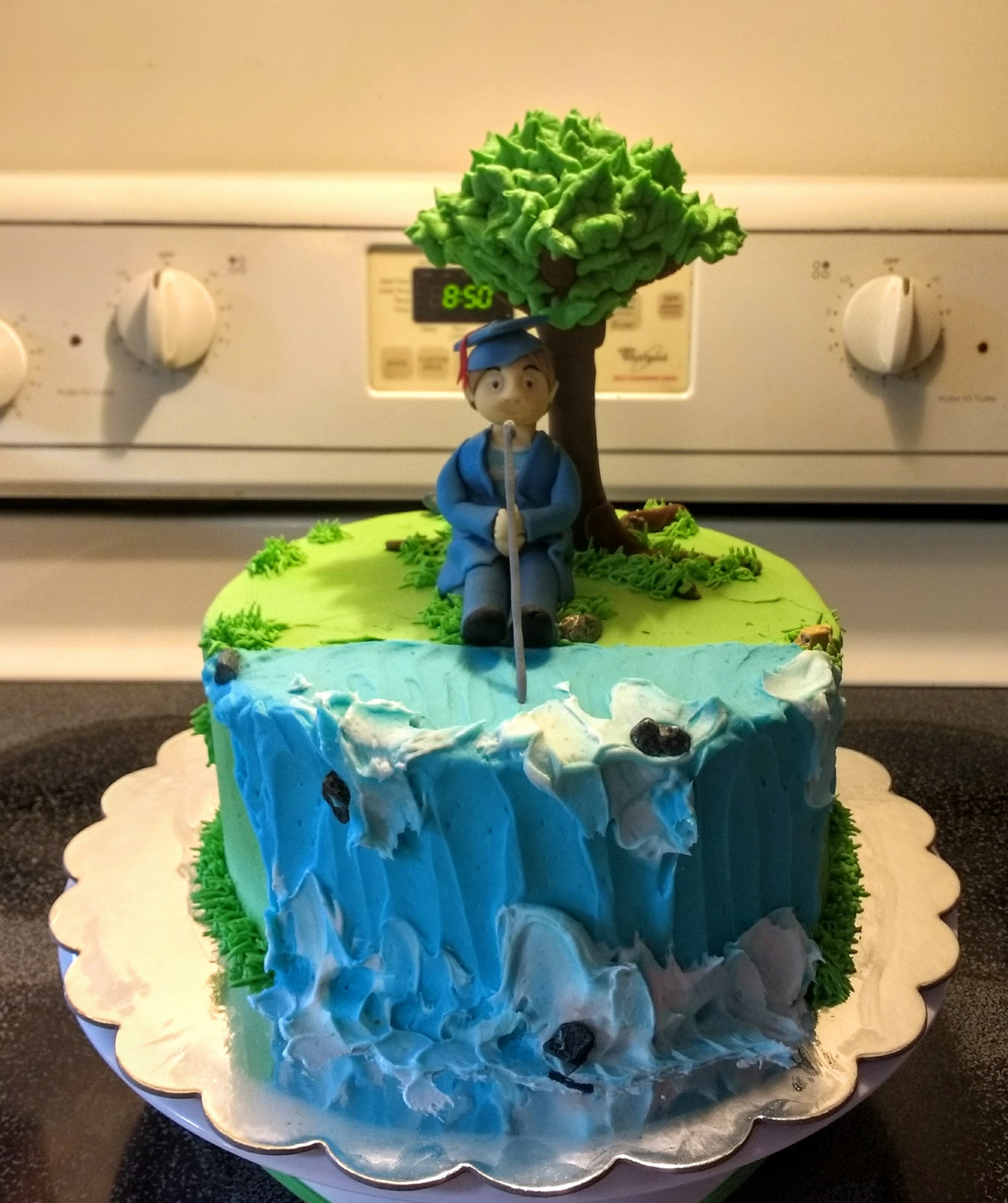 An 8″ vanilla cake iced with vanilla buttercream. The tree and boy are hand made from fondant and modeling chocolate.