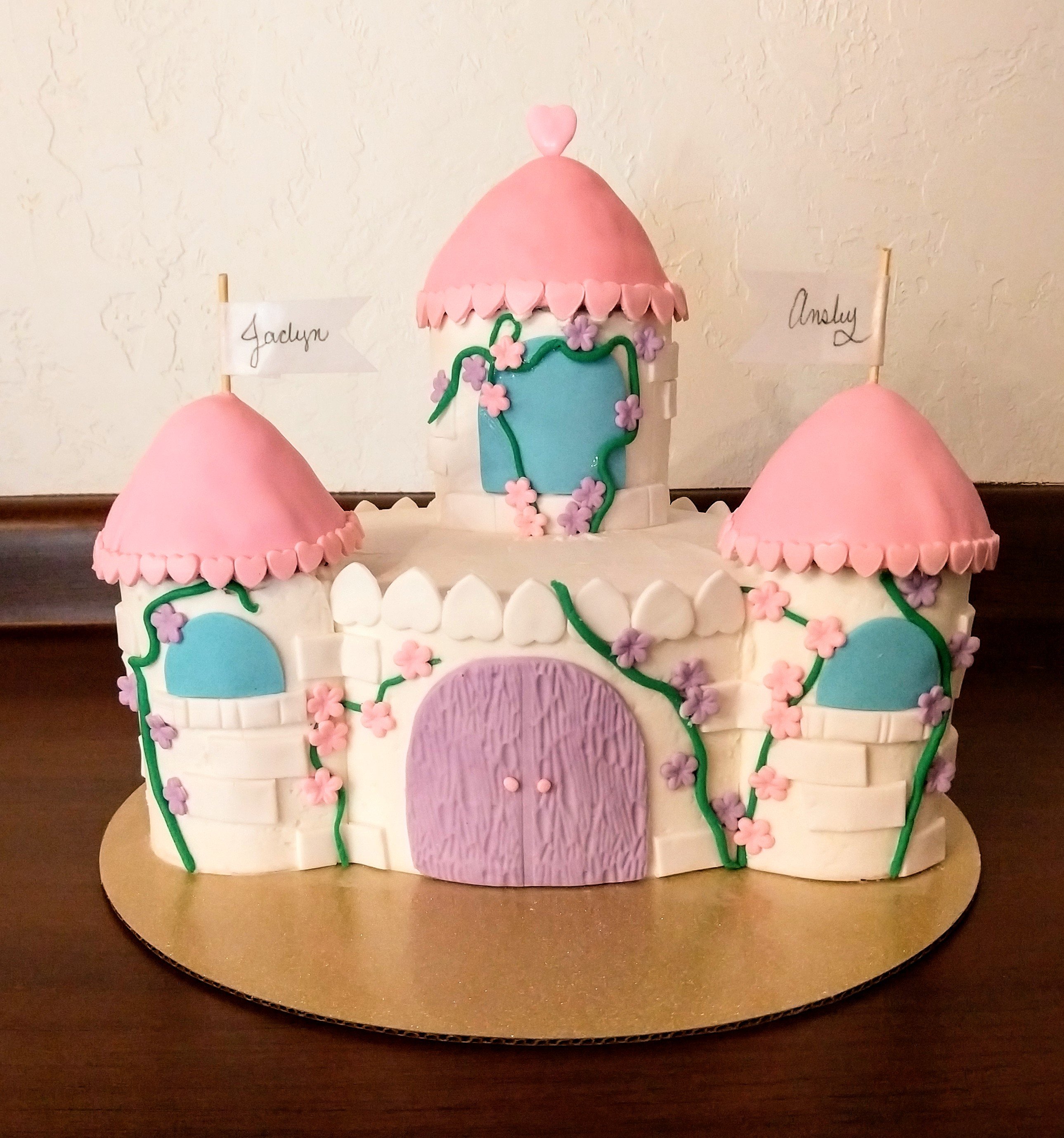 A raspberry flavored princess castle! All the decorations are hand made from fondant.