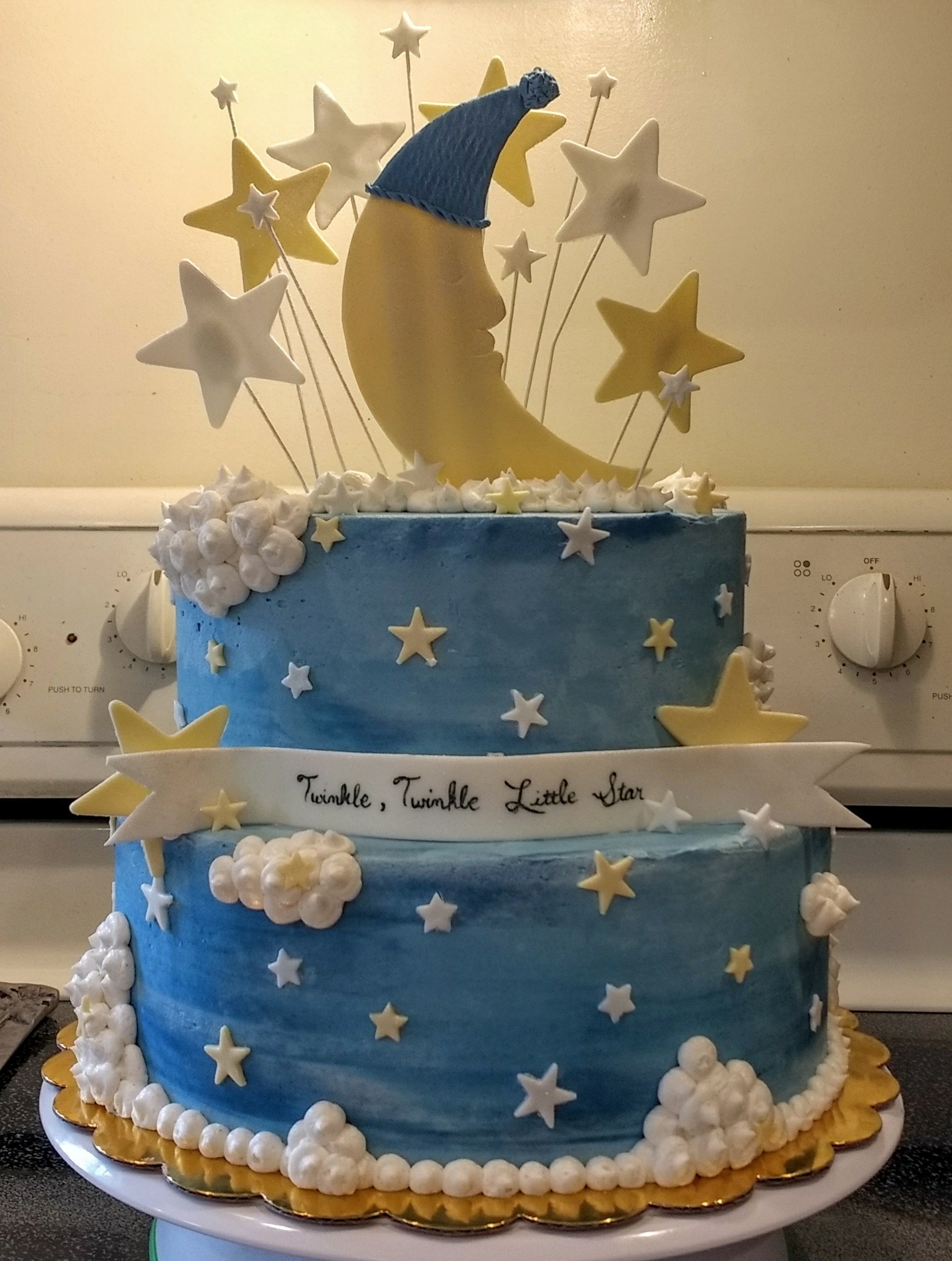 A 10″ chocolate cake and an 8″ vanilla cake. Both are iced with vanilla buttercream. All decorations are hand made from fondant.