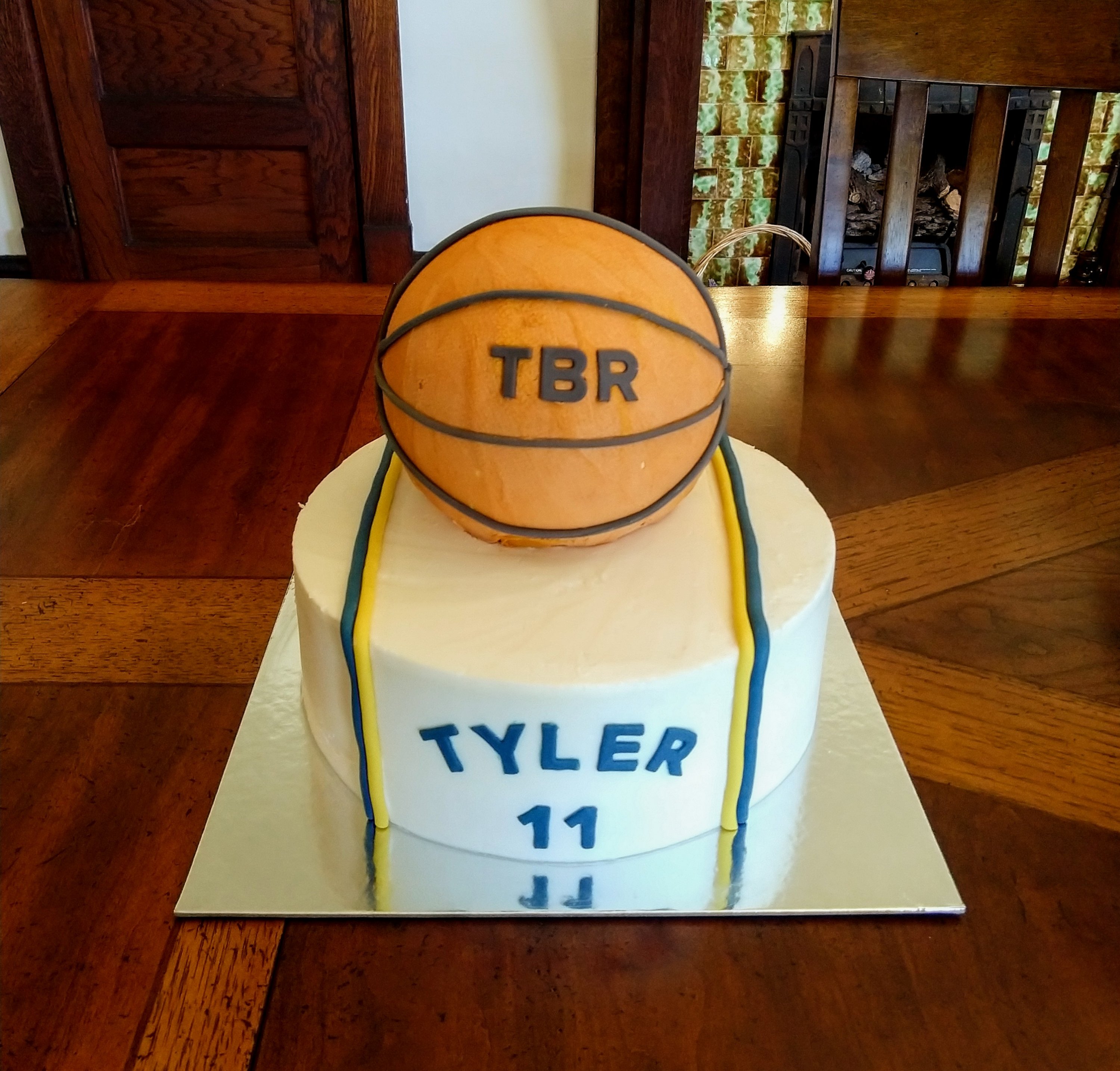 A 10″ chocolate cake iced with vanilla buttercream. The ball is vanilla cake iced with vanilla buttercream.