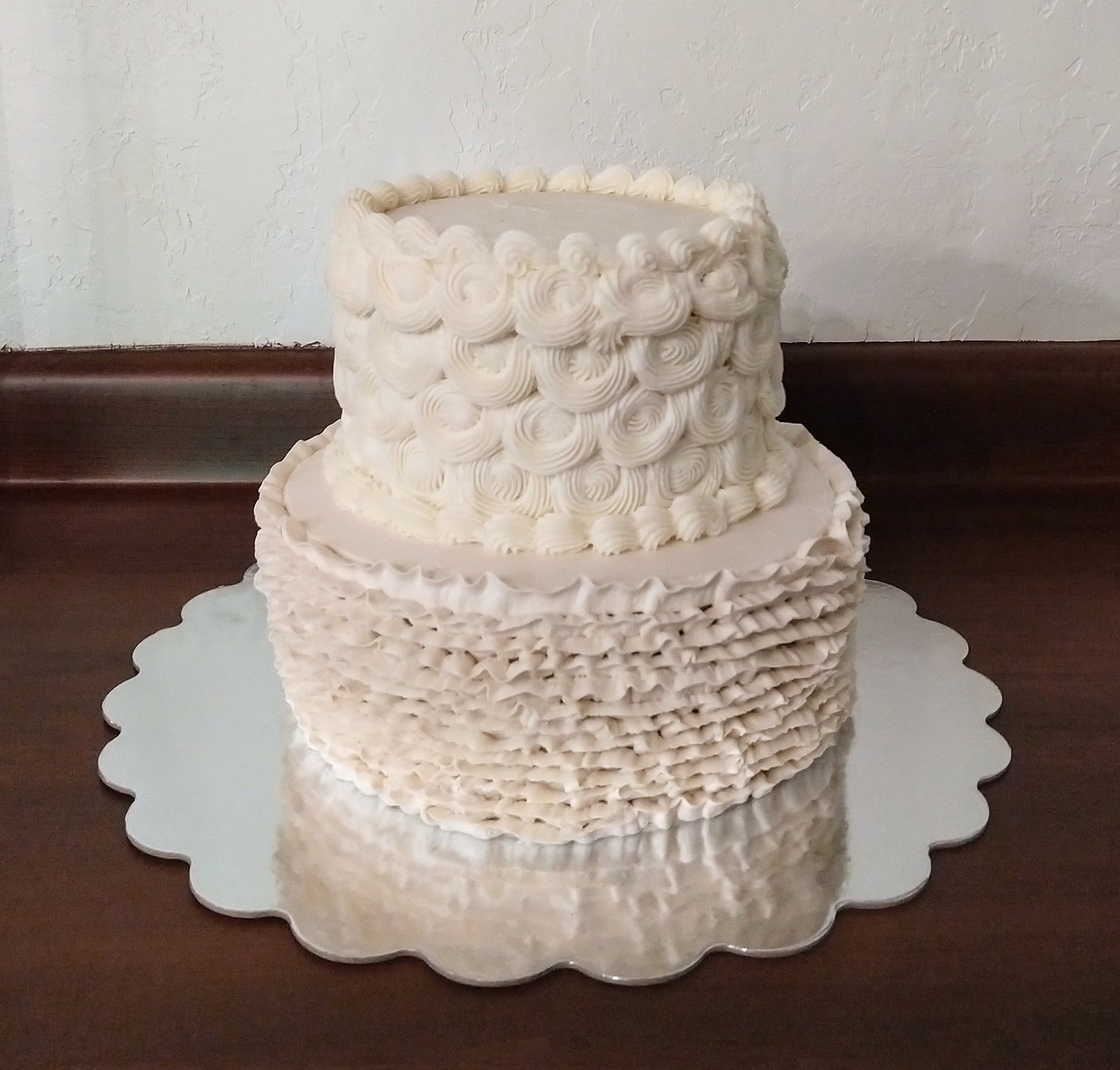 So, it’s not the prettiest but boy did it taste good! It’s an 8″ vanilla cake with a walnut and maple filling iced with maple buttercream. The top is a 6″ vanilla cake with a lemon curd filling and iced with a honey cream cheese buttercream. It was so yummy!