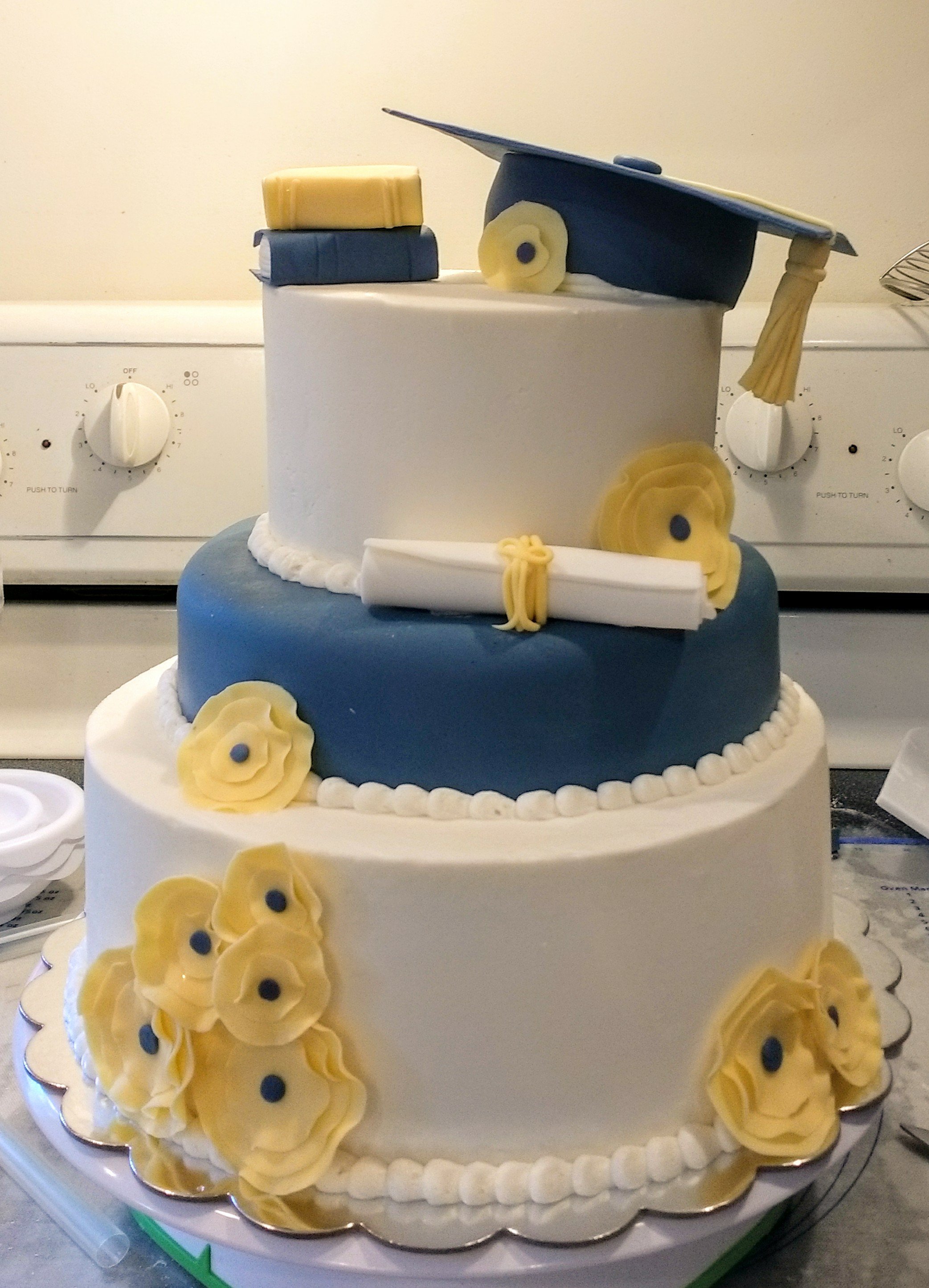 A 10″, 8″ and 6″ vanilla cake iced with vanilla buttercream. The 8″ is also covered in navy fondant. The decorations are all hand made from fondant.