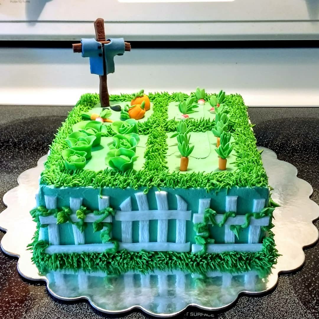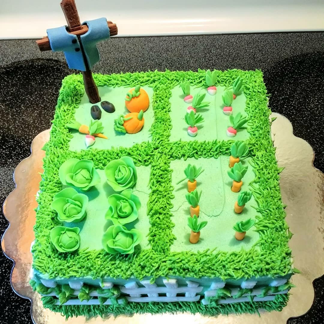 An 8″ square vanilla cake iced with vanilla buttercream. All decorations are hand made from fondant.