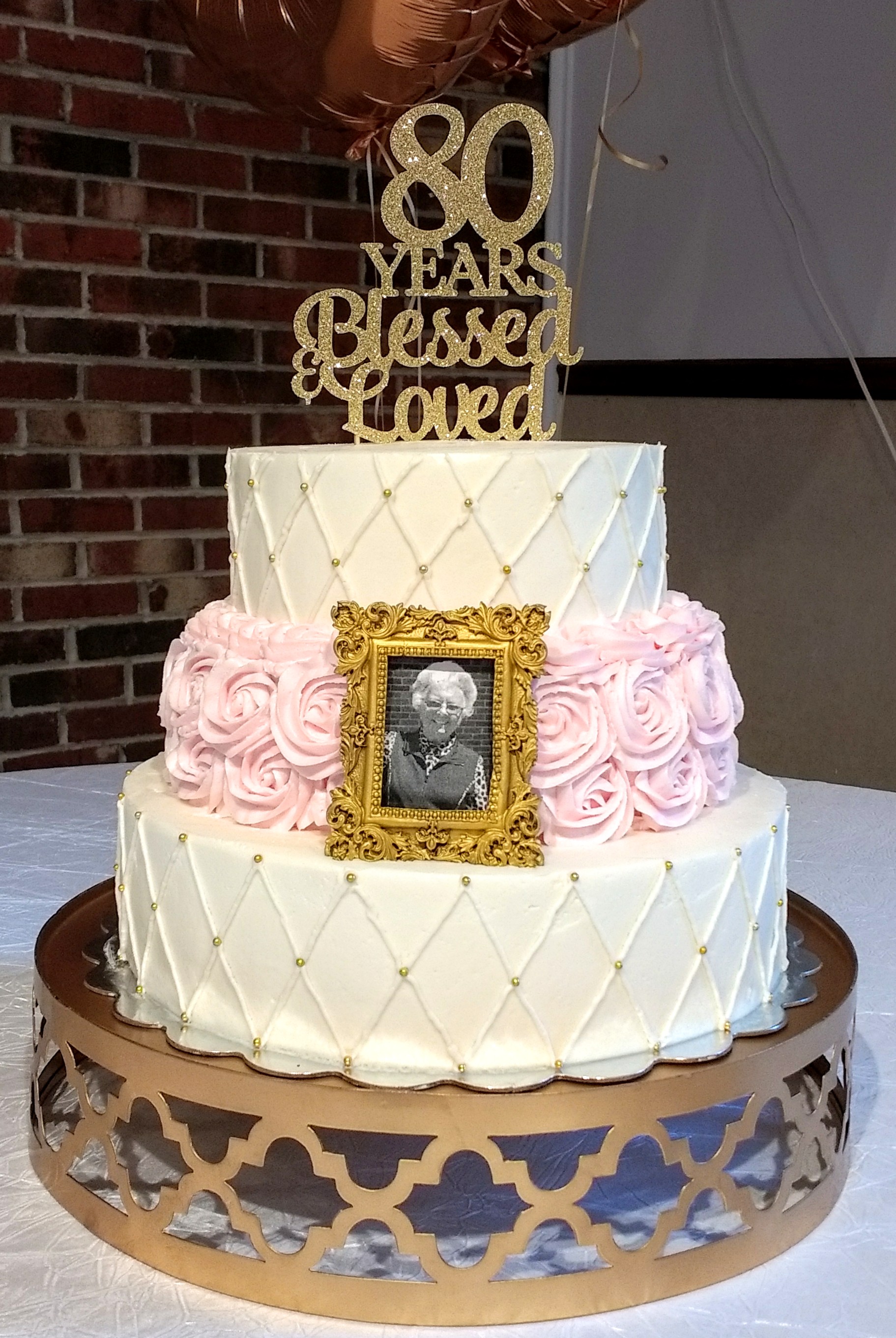 An 80th birthday celebration cake! An 8″ and 12″ vanilla cake iced with vanilla buttercream. A 10″ strawberry cake iced with strawberry buttercream. The frame is made out of fondant.