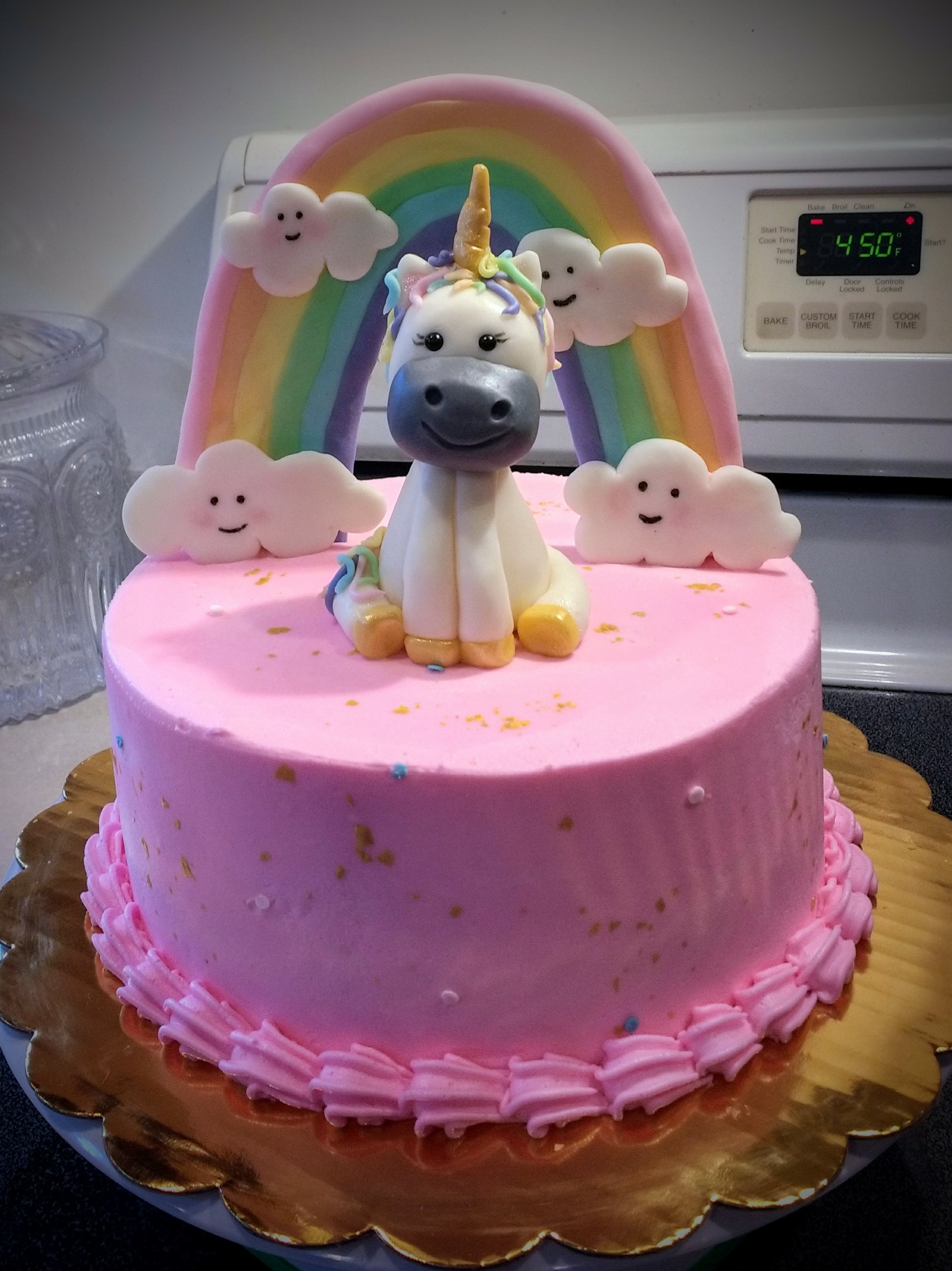 An 8″ vanilla cake iced with vanilla buttercream. The unicorn, rainbow and clouds are all hand made out of modeling chocolate.