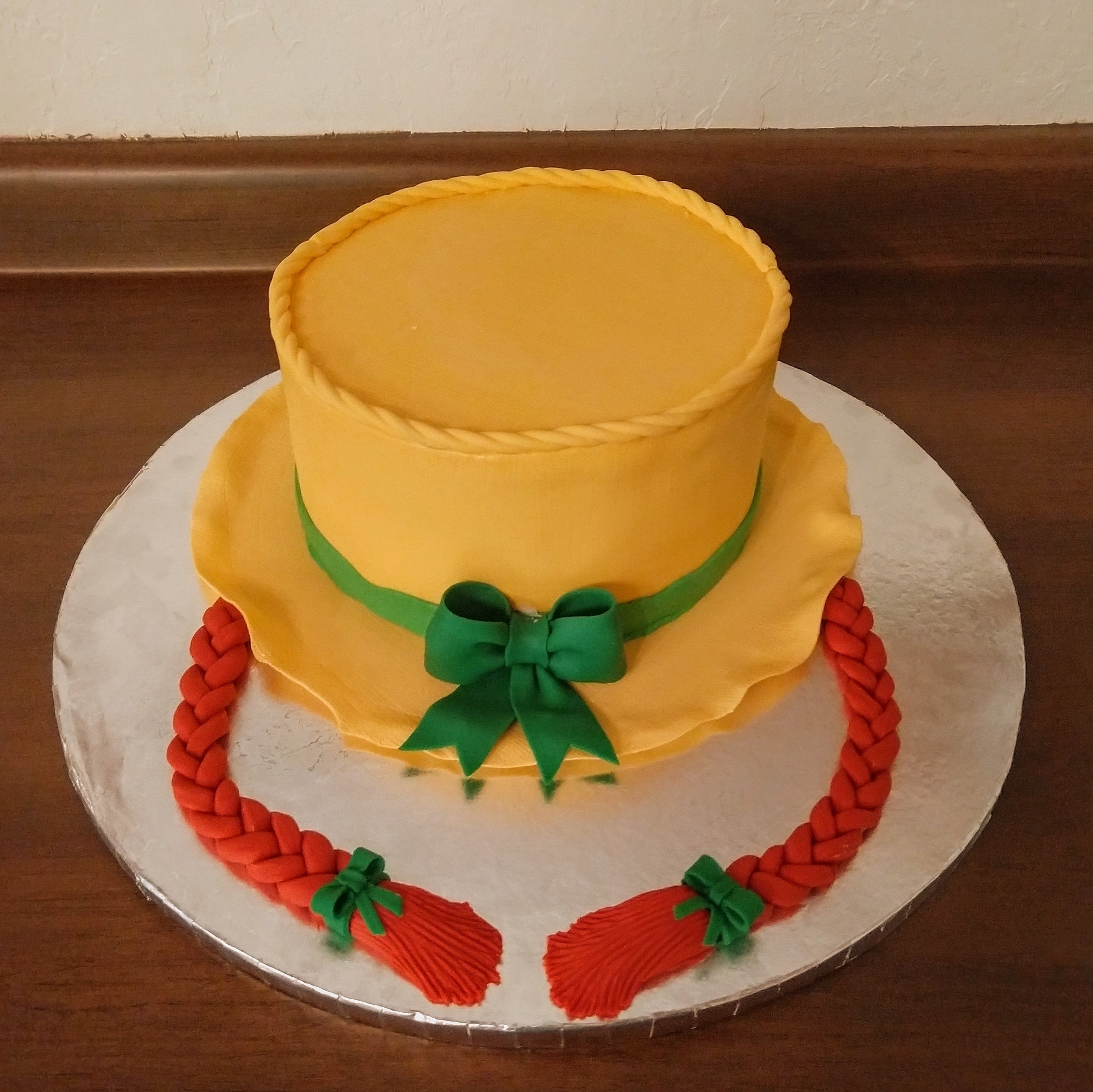 A 10″ and 6″ vanilla cake iced with vanilla buttercream icing. The top layer is also covered with blue fondant. All decorations are handmade from fondant.