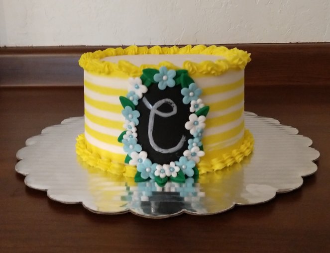A 6″ vanilla cake iced with vanilla buttercream. The pleasure t and flowers are hand made from fondant.