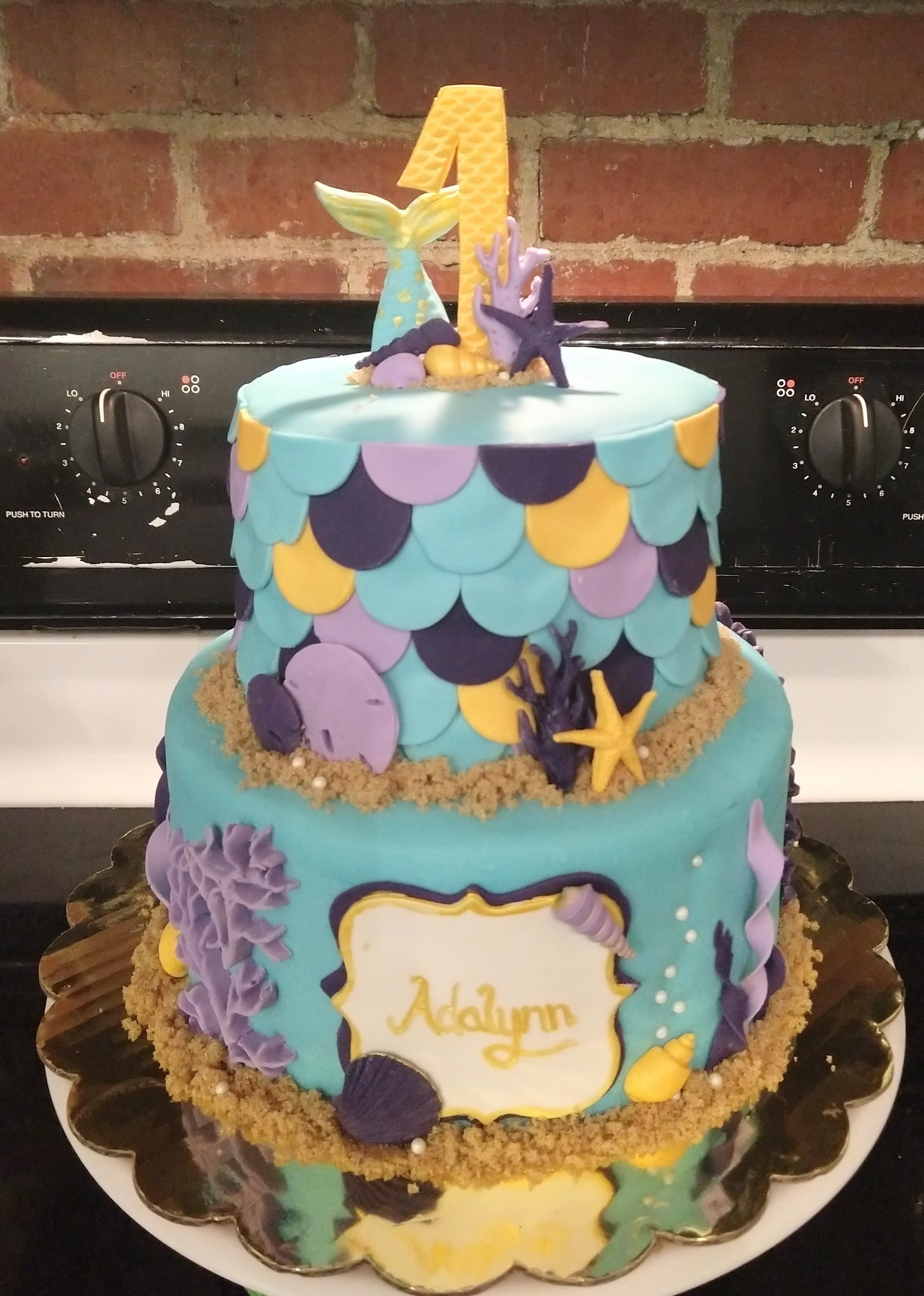A 6″ orange creamsicle cake and an 8″ vanilla, coconut and pecan cake. Both are iced with vanilla buttercream. The decorations are hand made from fondant. The color variation is done with an air brush.